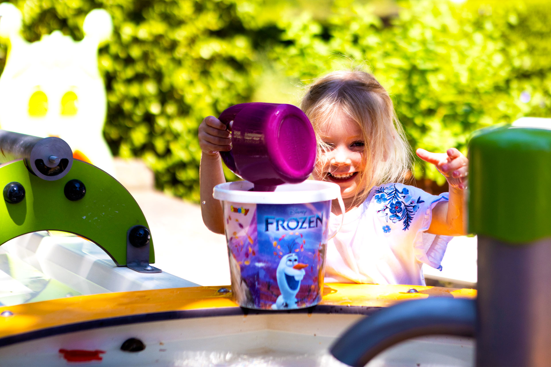 A play area for toddlers is located near the bar, with a playhouse, tunnel and water play area, plus toys and benches for parents. The trampoline is right next door.